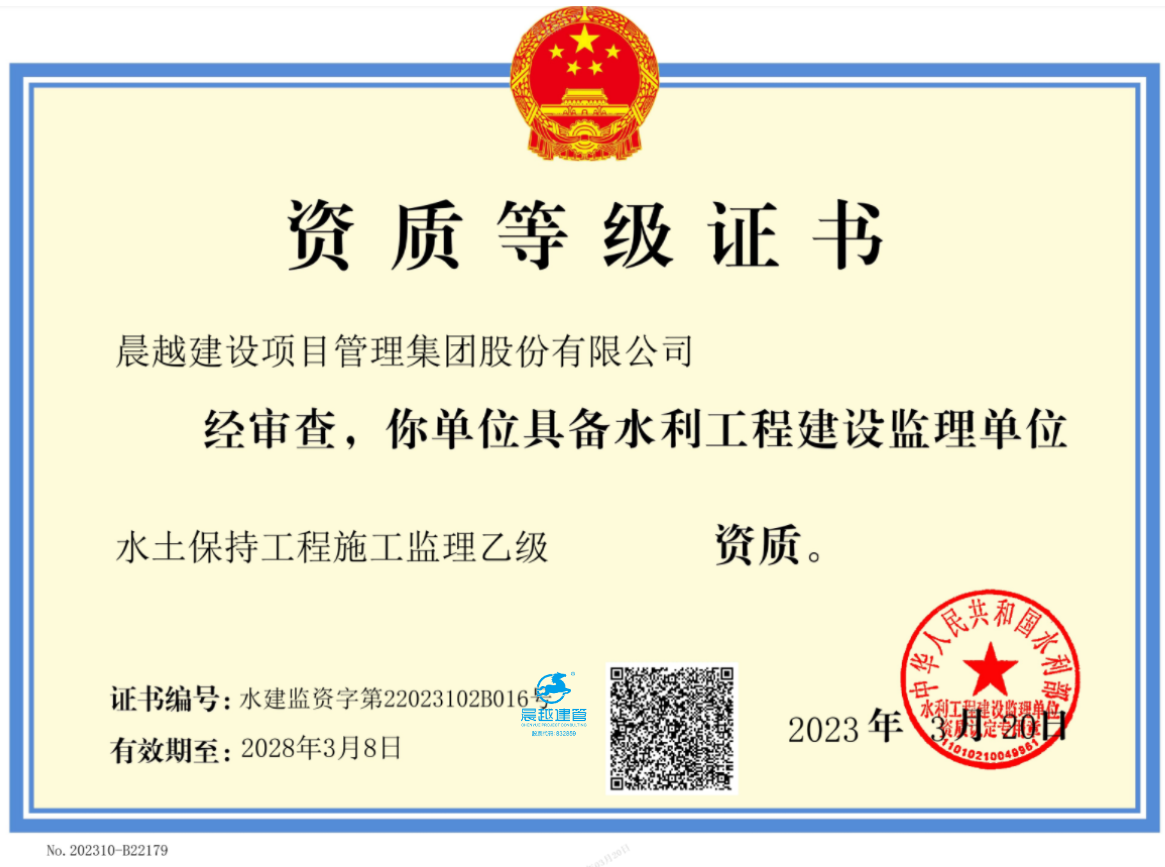 近日,集团取得中华人民共和国水利部颁发的《水利工程建设监理单位资质等级证书》水土保持工程施工监理乙级资质,证书编号:水建监资字第22023102B016号,有效期至2028年3月8日。