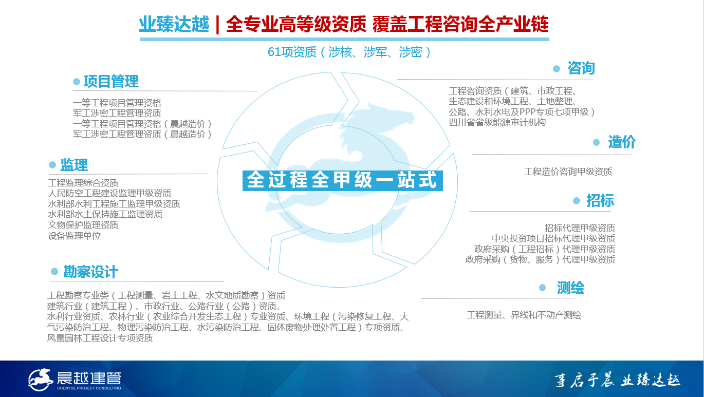 截止目前,集团已拥有61项资质,业务能力覆盖工程咨询全产业链。晨越建管集团将继续秉承“对结果负责”的核心理念,以全过程工程咨询服务为龙头带动工程咨询全产业链各类业务全面发展。