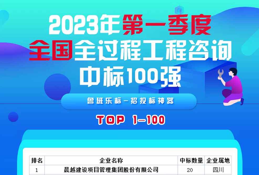 2023年4月12日,鲁班乐标发布“2023年第一季度全国全过程工程咨询中标100强”榜单,晨越建管集团以中标20个项目位列百强榜首。继2020年、2021、2022年连续四年晨越建管位列全国全咨中标百强榜第一名之后,晨越全咨再拔头筹!