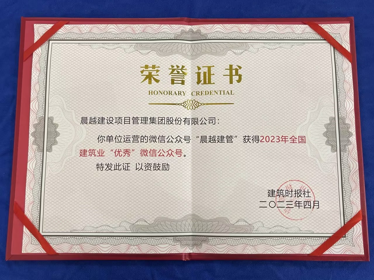 4月20日,由建筑时报社主办的“2023建筑业微信公众号运维经验交流研讨会暨全国建筑业优秀公众号颁奖典礼”在广西南宁召开。集团运营的官方微信公众号“晨越建管”获得2023年全国建筑业优秀微信公众号。