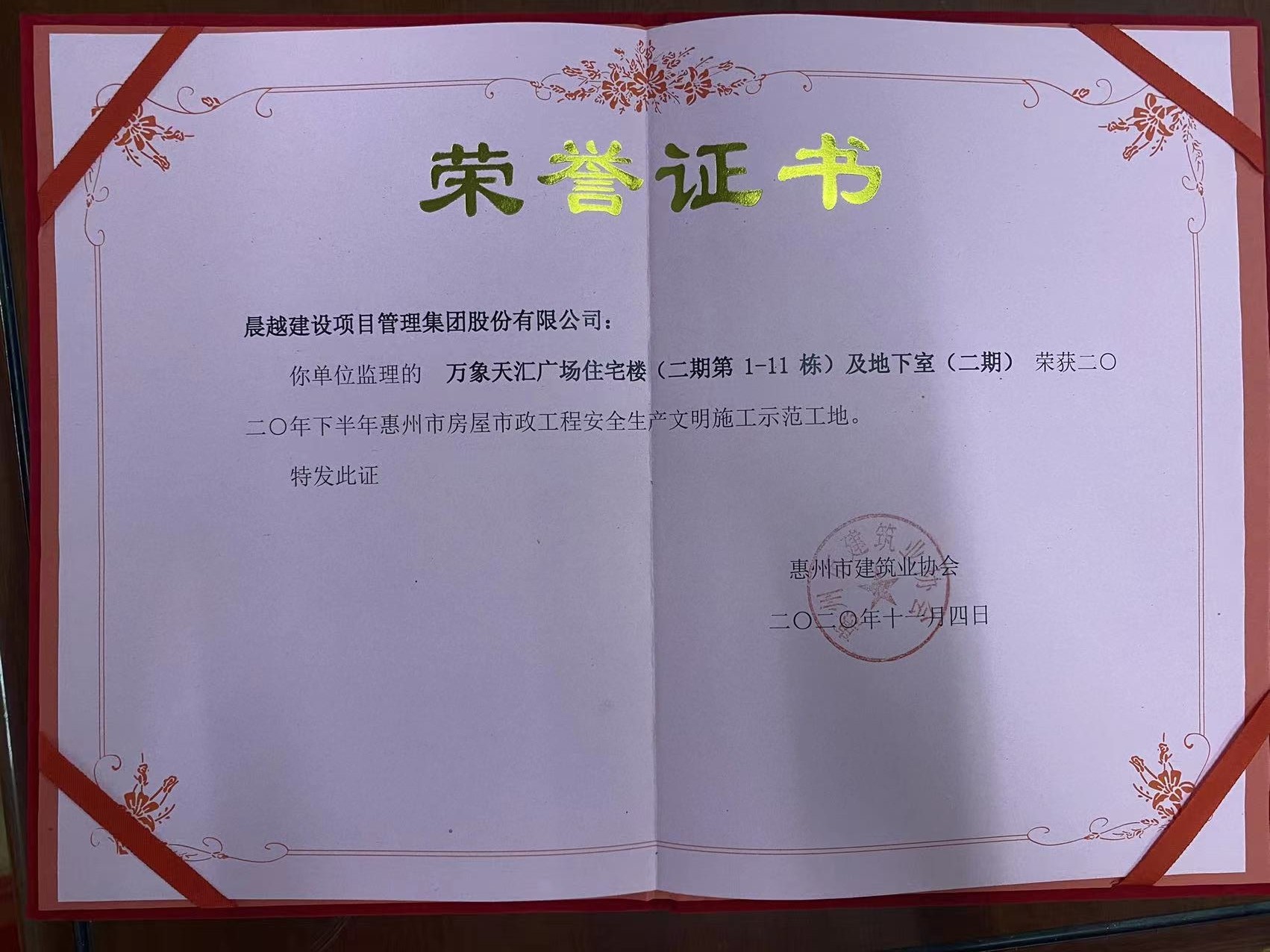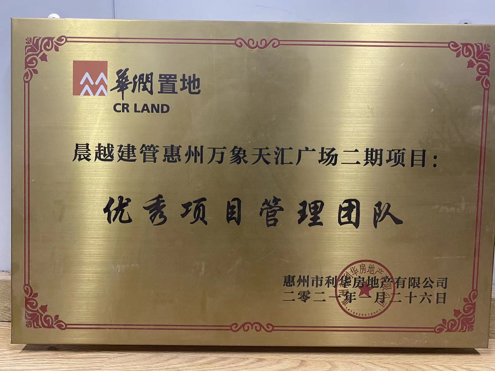 2020年,二期项目被惠州市建筑业协会评为《安全文明施工示范工地》,二期项目被华润置地评为《优秀项目部》,2021年二期、五期均被华润置地评为《优秀项目管理团队》。