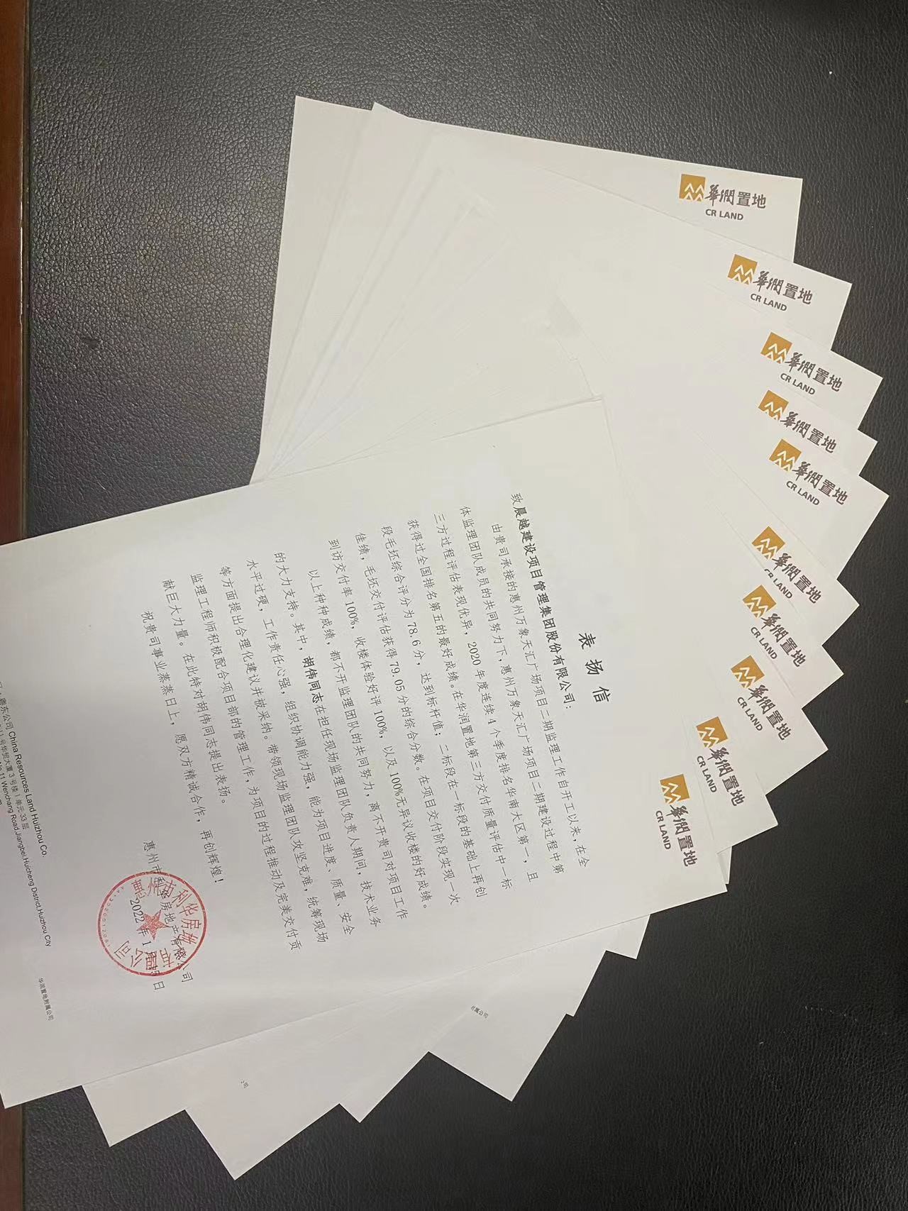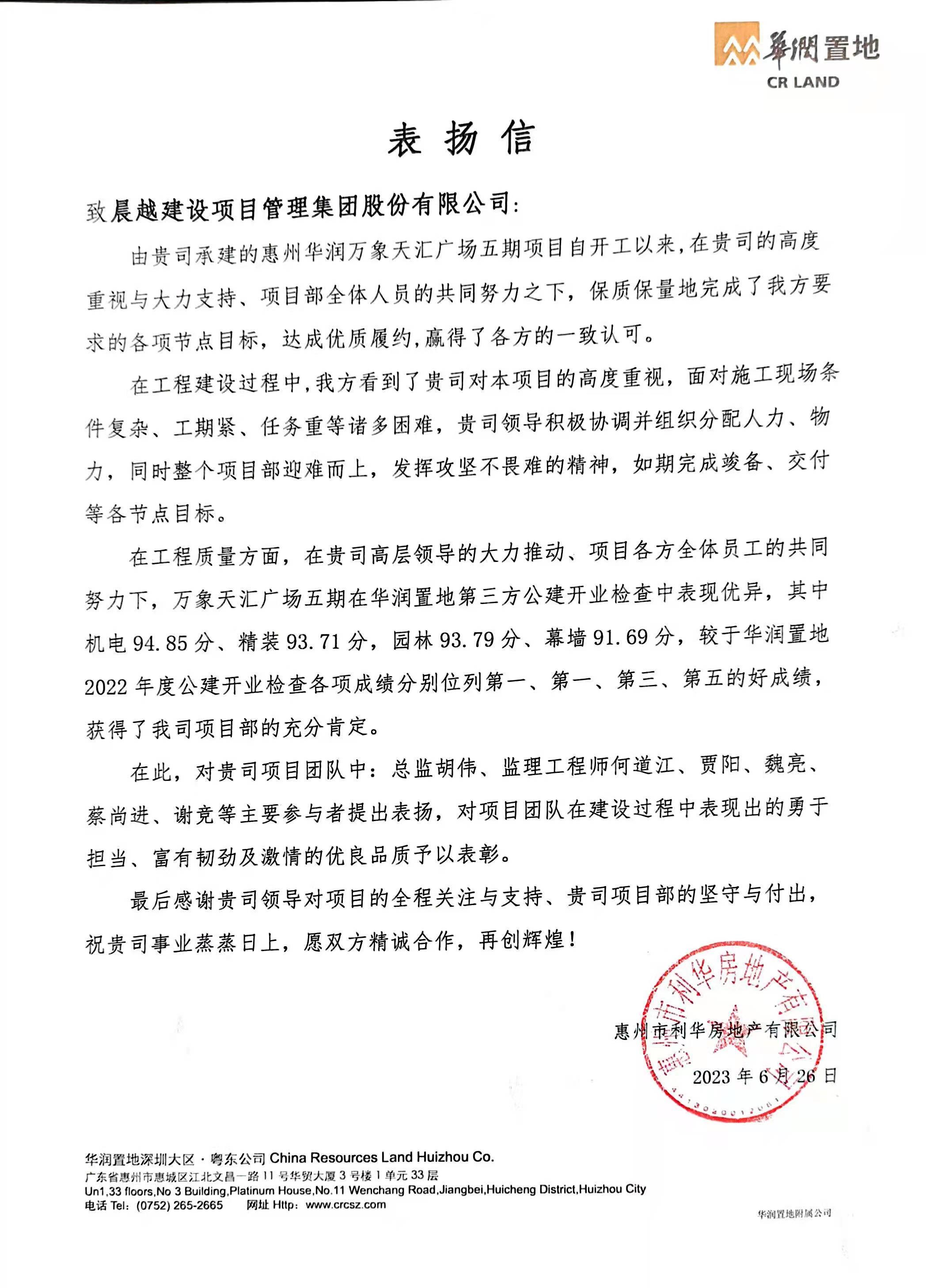 近日,晨越建管集团收到华润置地《表扬信》,对集团优质履约完成惠州华润万象天汇广场五期各项节点目标表示感谢,对项目团队迎难而上、勇于担当、富有韧劲和激情的优良品质予以表彰。