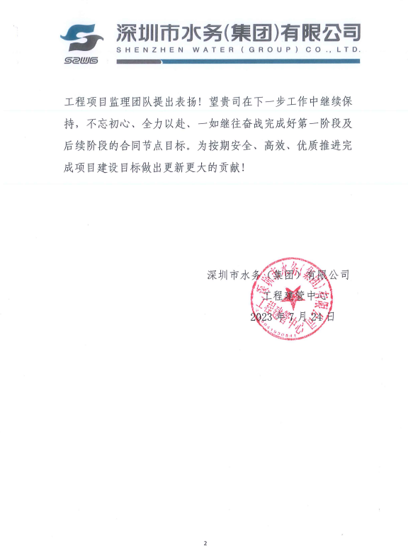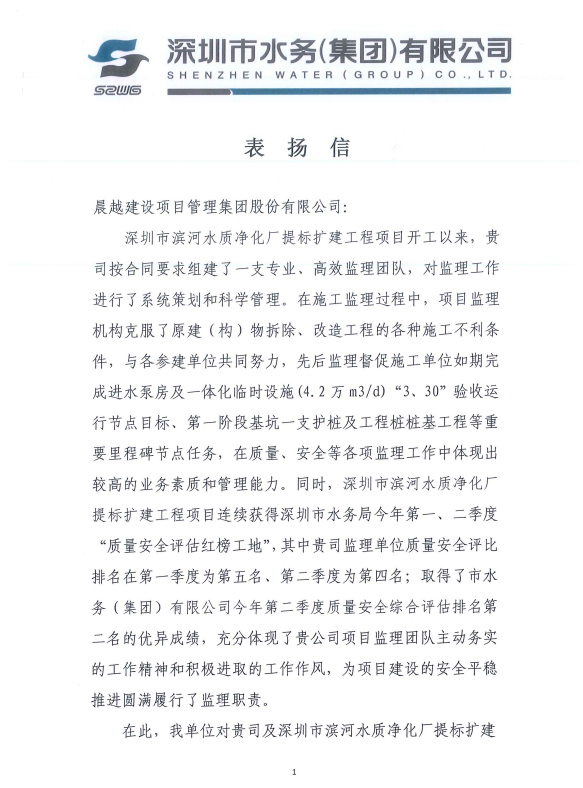 近日,晨越建管集团收到深圳市滨河水质净化厂提标扩建工程项目收到业主单位深圳市水务(集团)有限公司发来的表扬信,对集团及项目团队的辛勤付出表示感谢,对项目部取得的成绩给予高度肯定和表扬。