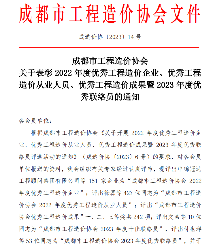 近日,成都市工程造价协会公布了“关于表彰 2022 年度优秀工程造价企业、优秀工程造价从业人员、优秀工程造价成果暨 2023 年度优秀联络员”等获奖名单。