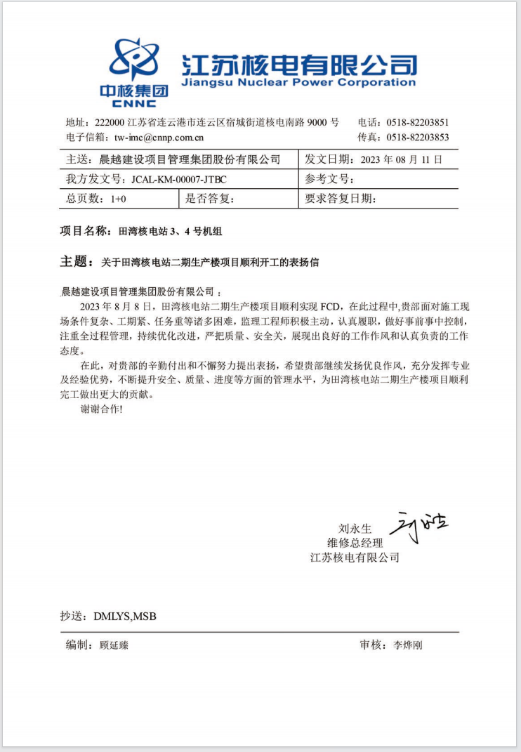 8月11日,集团收到江苏核电有限公司发来的表扬信,对晨越及项目团队前期的辛勤付出表示感谢。此次荣获表扬信是对晨越项目团队“主动务实、积极进取”工作作风的充分肯定!