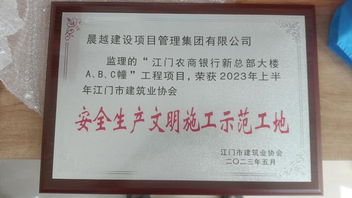 近日,集团承担的江门农村商业银行股份有限公司新总部大楼建设项目,荣获江门市建筑业协会颁发的2023年上半年“安全生产文明施工示范工地”称号。