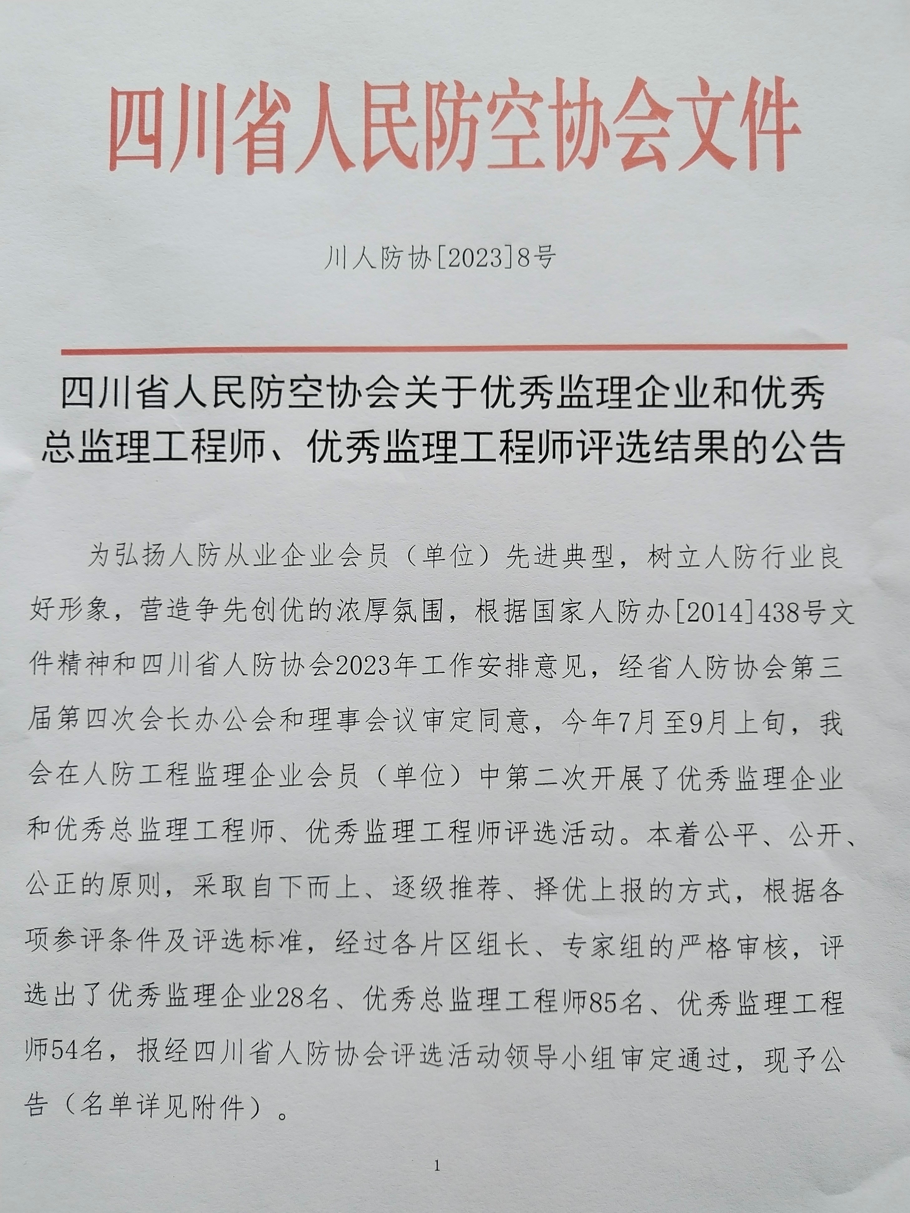 根据四川省人民防空协会监理专委会各项参评条件及评选标准,经过各片区组长、专家组的严格审核。此次共评选出了优秀监理企业28家、优秀总监理工程师85名、优秀监理工程师54名,并报经四川省人防协会评选活动领导小组审定通过。