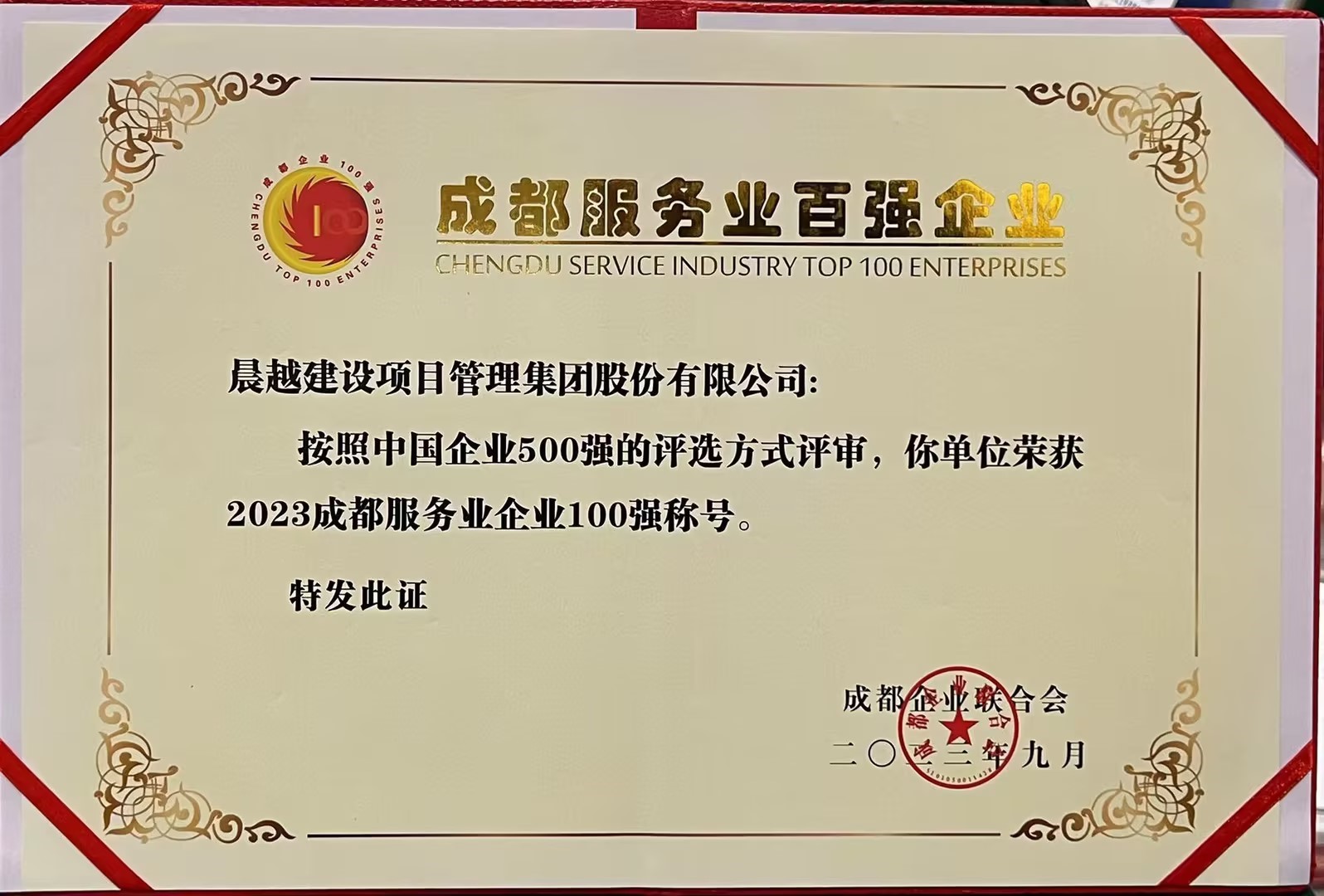 此次评选,得到了成都市经信局、市发改委、市国资委、市商务局、市市场监管局、市统计局、市工商联以及各区(市)县相关部门的大力支持和配合。经过各行业专家、经济领域专家从企业营业收入、净利润、资产总额、所有者权益、纳税总额、从业人数、研发人员人数、研发费用、信息化投入等多方面审核,最终评选出服务业、制造业等四大领域的“2023成都企业100强”名单。晨越建管集团荣获“2023成都服务业企业100强”荣誉!