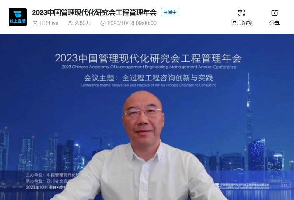 2023年10月18日上午,2023中国管理现代化研究会工程管理年会通过线上会议方式召开。本届年会由中国管理现代化研究会工程管理专委会主办,四川省全咨建设工程管理服务协会承办。来自全国高校的专家学者及工程管理领域的企业家、专业人士等两万三千余人在线参加了会议。