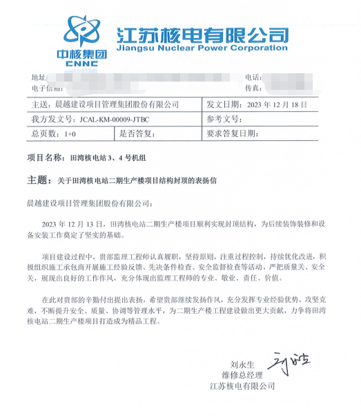 12月18日,集团收到中核集团江苏核电发来的《感谢信》。感谢晨越监理工程师认真履职,坚持原则,注重过程控制,持续优化改进,积极组织施工承包商开展施工经验反馈、先决条件检查、安全监督检查等活动,严把质量关、安全关,展现出良好的工作作风,充分体现出监理工程师的专业、敬业、责任、价值。