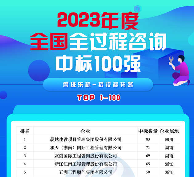 2024年1月16日,鲁班乐标发布“2023年度全国全过程咨询中标100强”榜单,晨越建管集团以中标83个项目位列百强榜首。这是晨越继荣获2020、2021、2022年度全国全过程咨询中标百强榜首之后,连续第四年荣获全国全咨中标百强榜第一名!