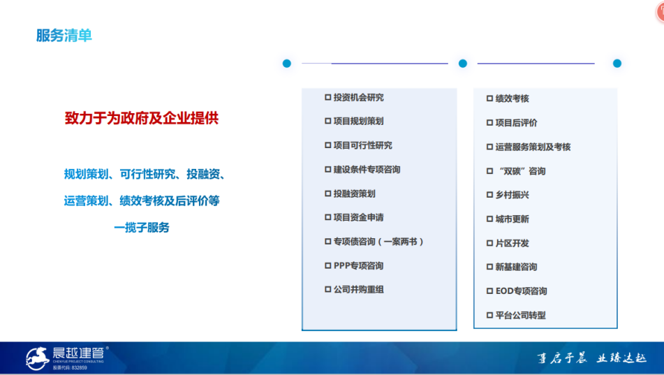 晨越建管集团工程咨询院以“咨询创造价值”为核心,坚持“投资决策专家+项目建设管家+项目运维顾问”定位,以工程建设项目投资决策综合咨询为导向,专注于基础设施与公共服务建设、城市更新与片区开发、碳达峰与碳中和、乡村振兴和“新基建”等全业务领域。