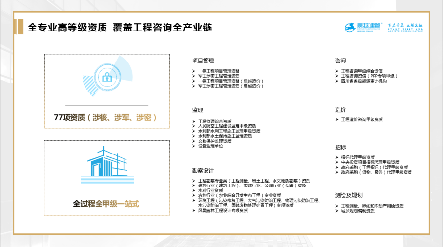 截止目前,晨越建管集团已拥有包括工程监理综合资质、工程咨询甲级综合资信等77项全专业高等级专业资质和资信(涉核、涉军、涉密),业务能力覆盖工程咨询全产业链。