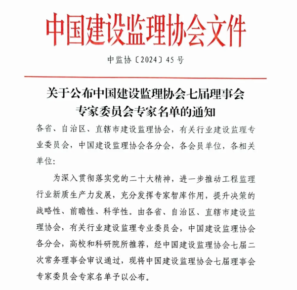 近日,中国建设监理协会发布《关于公布中国建设监理协会七届理事会专家委员会专家名单的通知》([中监协(2024)45号]),集团党委书记、董事长王宏毅再次获聘中国建设监理协会专家委员会委员。