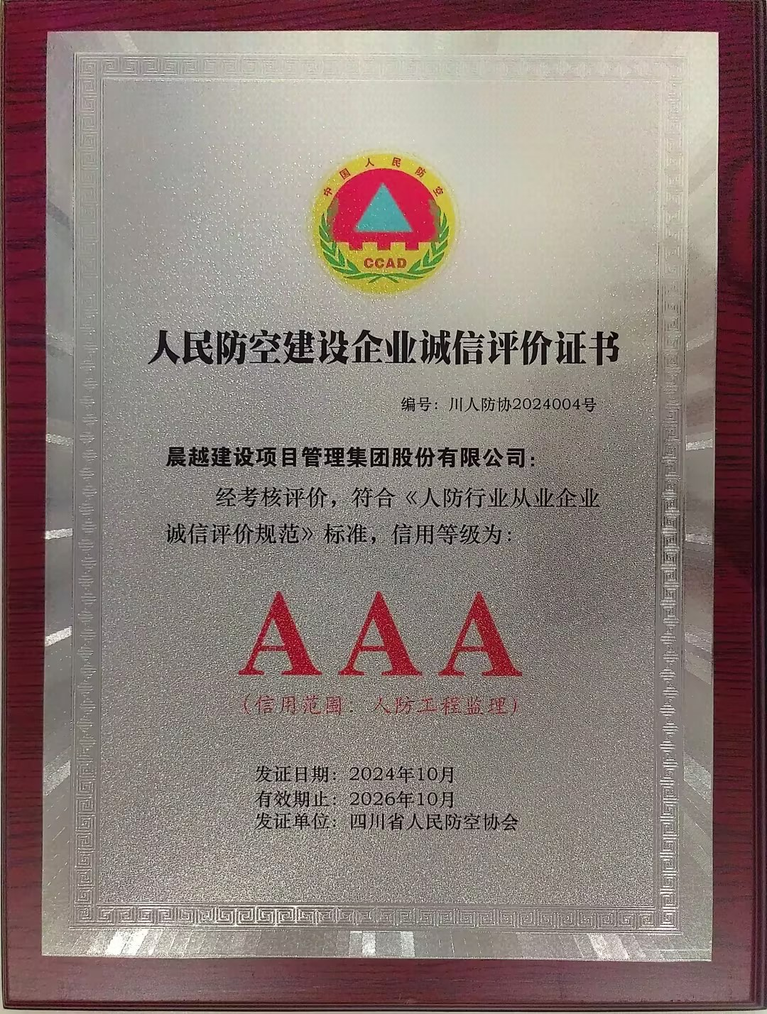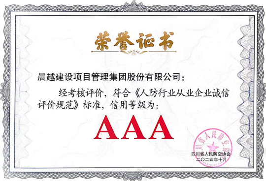 四川省人民防空协会根据《四川省人民防空协会会员(单位)诚信评价办法》、《四川省人民防空协会人防工程监理会员(单位)诚信评价考核标准》的要求组织开展了诚信评价活动,经过专家组对晨越建管集团经营活动信息、诚信建设、质量安全信息、信用信息、社会责任、发展创新方面的严格审核,最终集团获得“人防行业从业企业诚信评价AAA信用等级”荣誉。