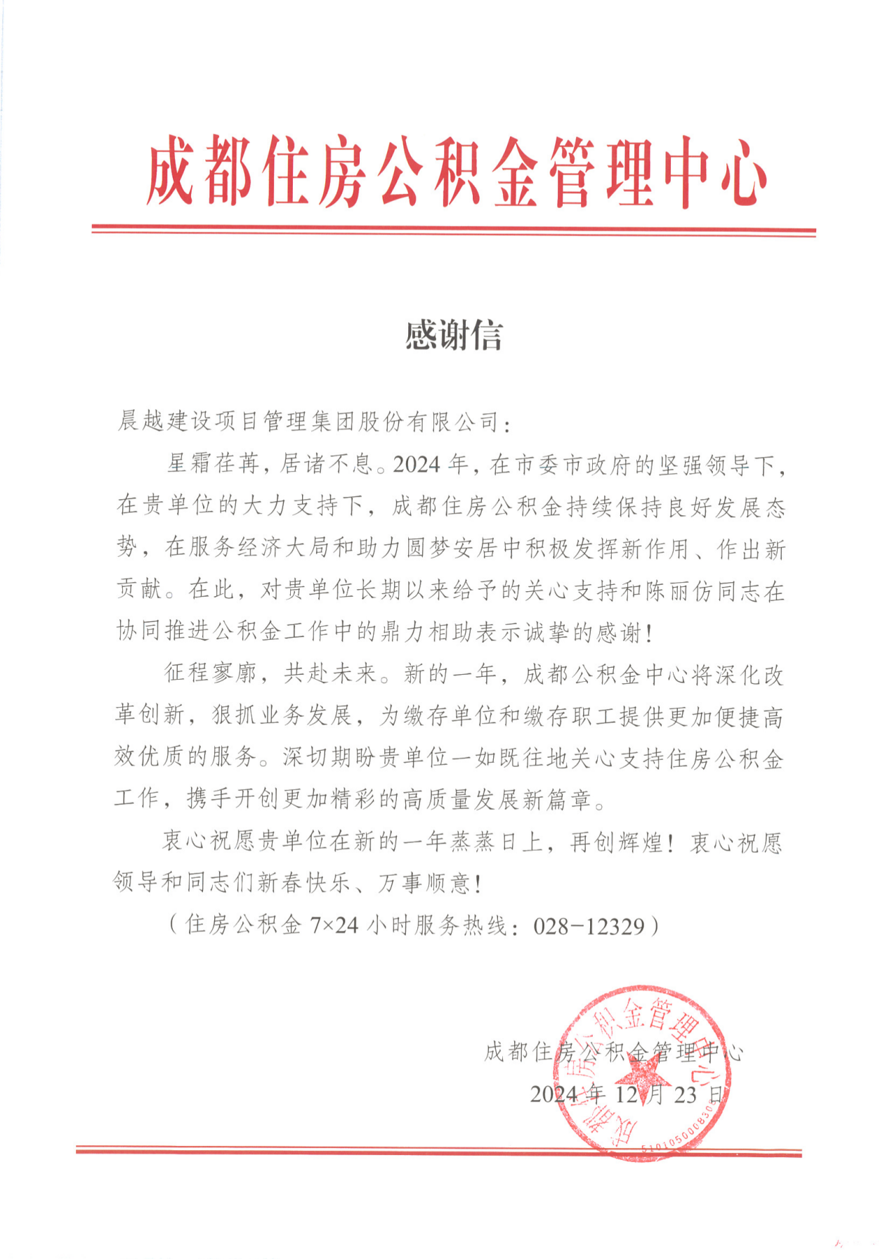 近日,晨越建管集团收到成都住房公积金管理中心发来的《感谢信》,对集团长期以来对公积金工作的支持表示诚挚的感谢。晨越建管集团一直秉持高度的社会责任感,积极参与公积金管理事务,助力公积金政策的有效落实和执行。