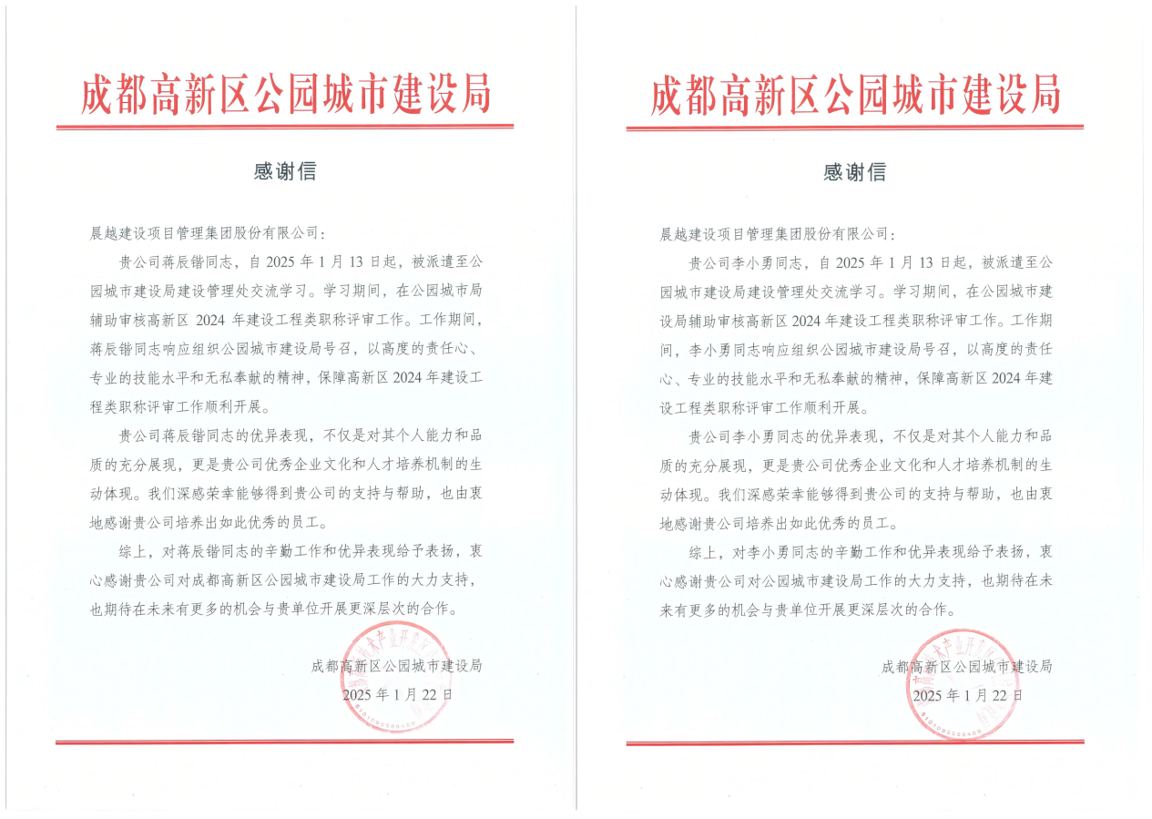 近日,晨越建管集团收到来自成都高新区公园城市建设局的《感谢信》,对集团员工李小勇和蒋辰锴支持高新区2024年建设工程类职称评审工作表示诚挚的感谢。