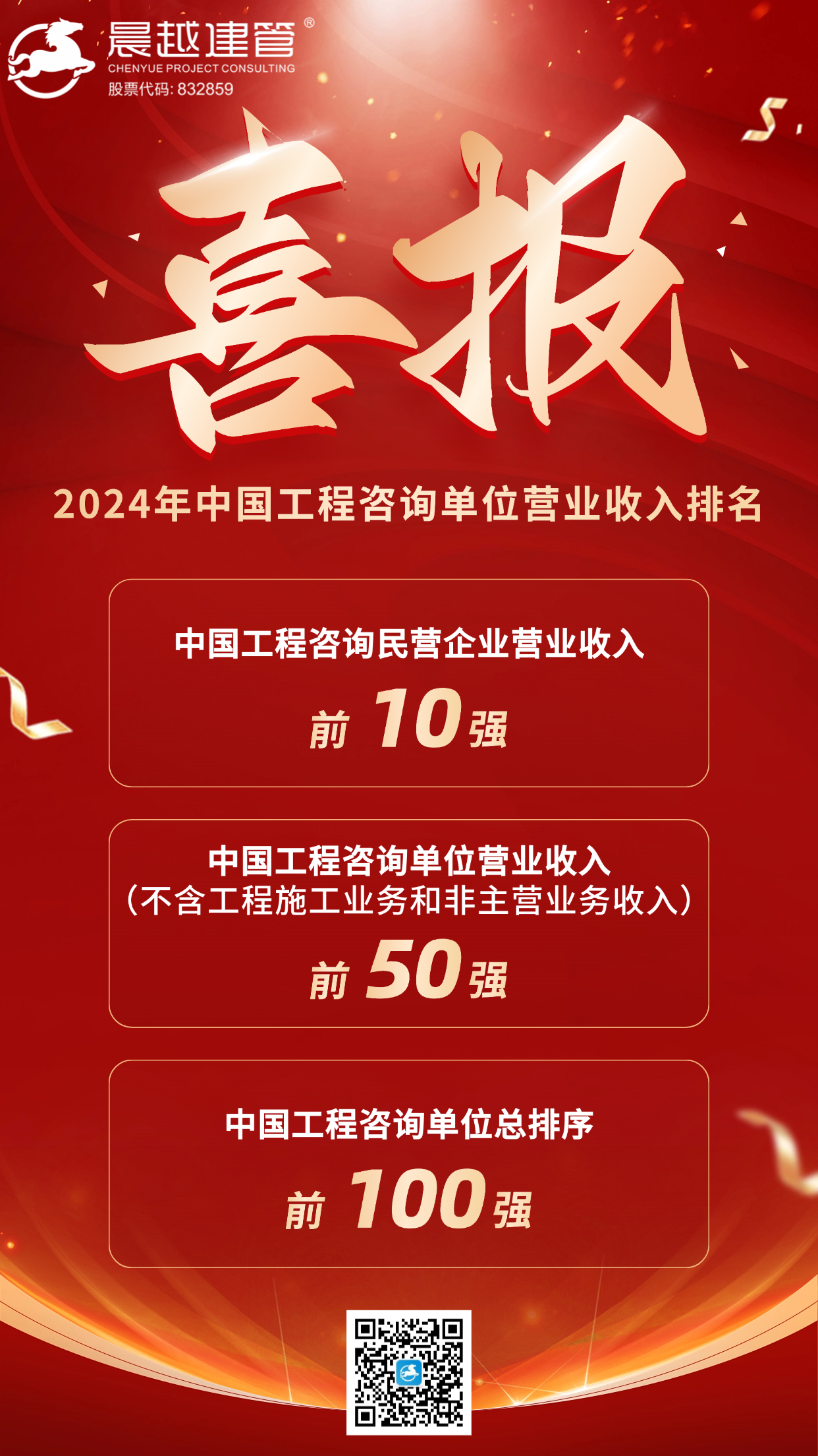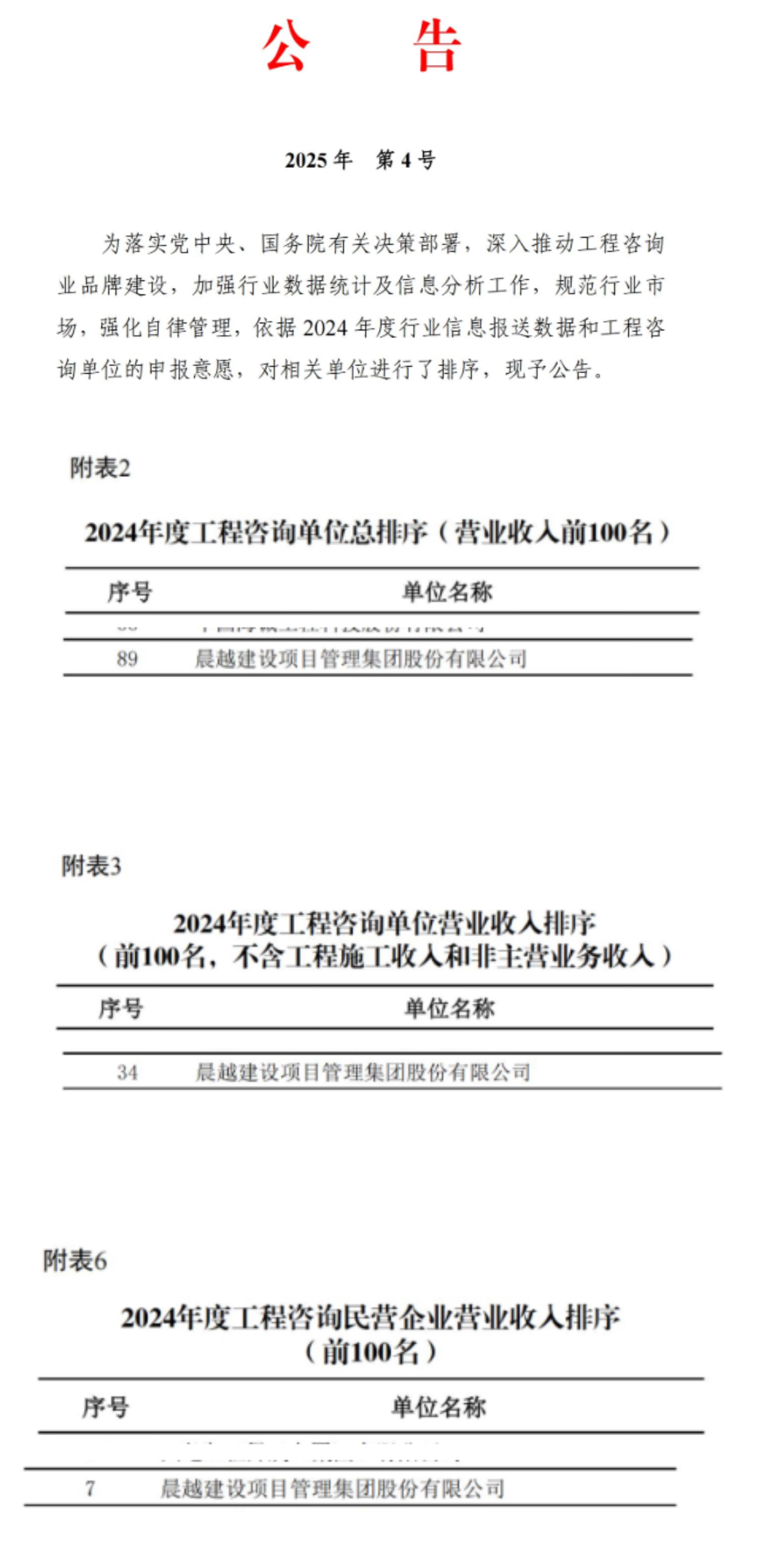 8月19日,中国工程咨询协会公布2024年度工程咨询单位100强(营业收入)、工程咨询单位营业收入(不含工程施工业务和非主营业务收入)100强、工程咨询民营企业营业收入100强名单,晨越建管集团位列中国工程咨询民营企业营业收入排名第7名、中国工程咨询单位营业收入(不含工程施工业务和非主营业务收入)排名第34名、中国工程咨询单位总排名(营业收入)第89名。该排名旨在落实党中央、国务院有关决策部署,深入推动工程咨询业品牌建设,进一步加强行业信息采集和应用的集中统一管理,更好发挥信息上情下达、下情上传作用。