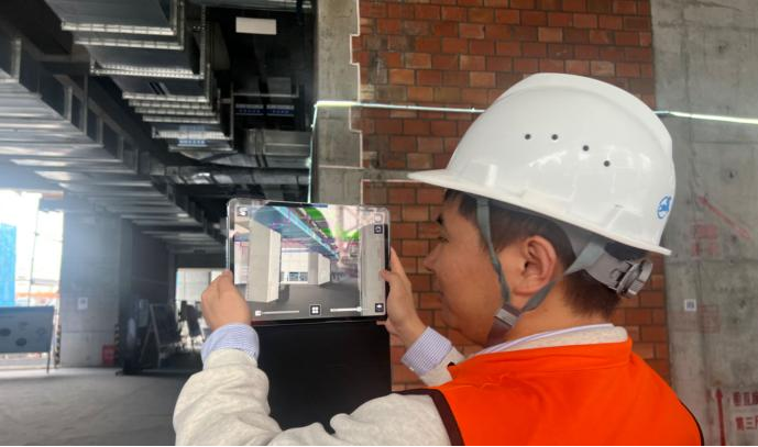 此外,项目创新性引入 AR 技术,将 BIM 模型投射至实体环境中,对项目重难点区域进行实模对比,实时发现并解决问题,有效辅助机电安装实体与模型校核、钢结构构件与模型校对等工作,确保施工精度与工程质量,为项目建设提质增效。
