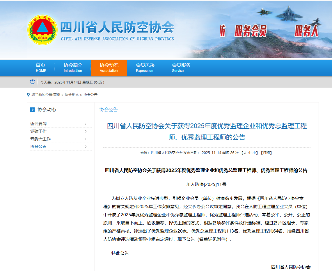 近日,四川省人民防空协会发布关于获得2025年度优秀监理企业和优秀总监理工程师、优秀监理工程师的公告。集团成功斩获“2025年度优秀监理企业”称号,同时集团13名总监理工程师、7名监理工程师分别获评“优秀总监理工程师”“优秀监理工程师”荣誉。