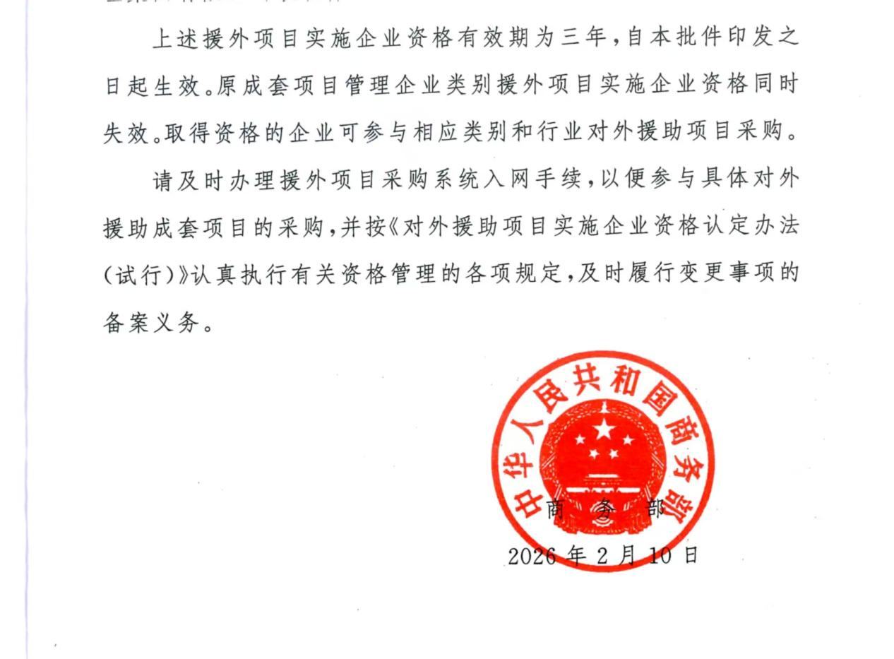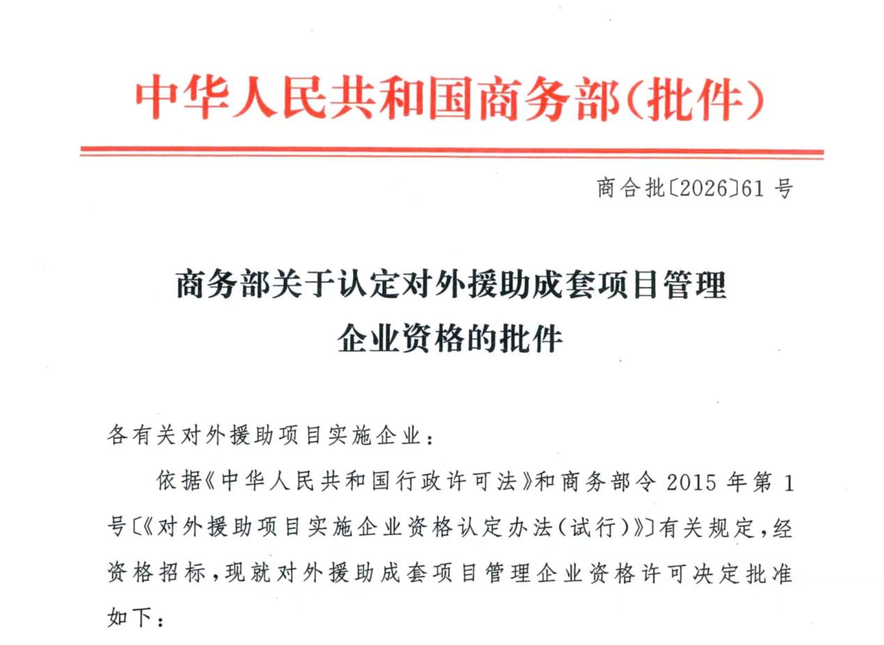 近日,商务部正式下发《关于认定对外援助成套项目管理企业资格的批件》(商合批〔2026〕61号),晨越建管集团成功获得对外援助成套项目管理企业资格。该资格的取得,标志着集团正式取得承接国家对外援助成套项目管理的业务许可,是国家主管部门对晨越专业实力、管理体系与服务能力的权威认可,更是集团融入国家对外开放大局、开拓国际市场进程中具有战略意义的重要里程碑。