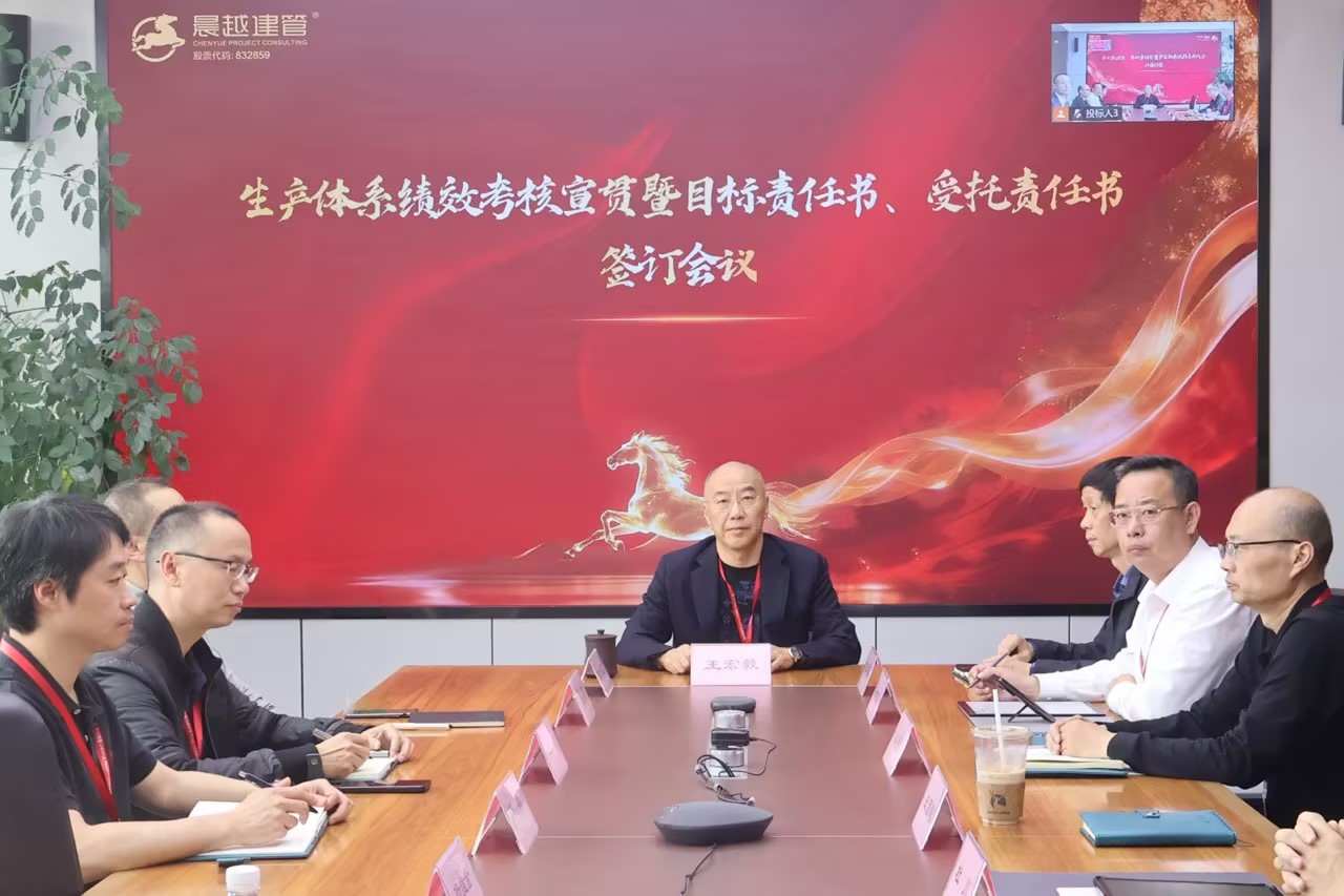 为深化全咨项目精细化管理,压实项目管理责任,规范绩效考核体系,2026 年 4 月 10 日,集团生产体系绩效考核宣贯暨目标责任书、受托责任书签订会议顺利召开。会议采用“线上+线下”结合形式举行,晨越建管集团党委书记、董事长王宏毅出席会议,集团高管、全咨项目部专业板块负责人及相关岗位人员参会。