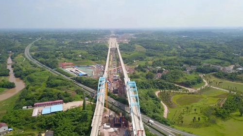 2021年5月21日上午10时,在隆隆的鞭炮与欢呼声中,自贡东站配套设施项目全长1.07km的高架桥最后一联钢箱梁成功吊装合龙,标志着高架桥主体全线贯通,为确保2021年6月30日工程正常投入使用又进了一步。