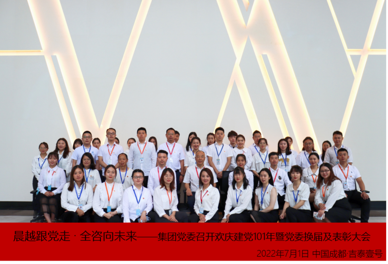 2022年7月1日,集团党委召开“晨越跟党走·全咨向未来——庆祝建党101周年暨晨越党委换届及表彰大会”,集团成都区域党员、入党积极分子共45人在党群活动室参加会议。党委书记、董事长王宏毅出席会议并讲话。