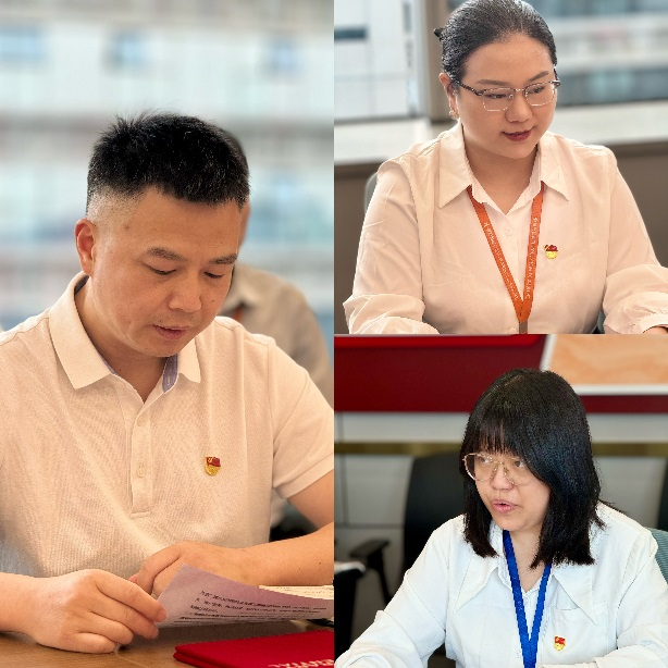 随后,优秀党员代表曾凤(财务部常务副经理)、刘彬(人武系统负责人、吉泰物业副总经理),先进党支部代表陈倩(造价支部书记)、张亚飞(工程支部书记、光场调控项目联合党支部组织委员),入党积极分子刘俊武(总裁助理)先后发言。