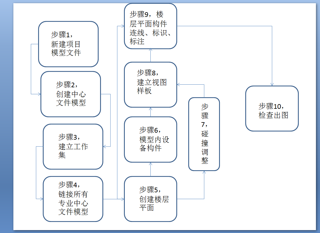 步骤1,建议采用已有项目样板或者Revit自带的项目样板,可节省部分工作量。步骤2,应采用正确以及统一的方式方法创建中心模型文件,否则可能会导致各专业项目基点不一致的情况发生,从而影响后面的模型链接。步骤3,标高和轴网应为单独工作集,链接各专业模型应为单独工作集,其余见后续工作集相关规则方法或是BIM的行业规范。步骤4,确保链接模型位于正确的工作集,各专业项目基点一致。步骤5,基于建筑标高创建相应楼层平面,不建议天花平面用于出图,但可用于构件调整视图;建筑空间结构复杂项目,应确保建筑的每个房间都被完整地表达在楼层平面。步骤6和步骤7同步进行,保证模型实时更新,及时沟通解决碰撞。步骤8,在确保解决所有碰撞后方可创建视图样板用于出图。步骤9,应在步骤5同时绘制系统图、说明和图例,建议采用在一个空白楼层平面加范围框的方式确保楼层平面内容的表达完整,满足规范,符合审图要求。步骤10,检查各楼层平面的是否出现构建消失问题,链接文件均为半色及底图显示。