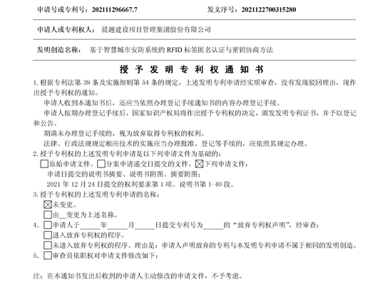 晨越建管统筹旗下企业技术中心、院士工作站等高端工程研发机构,共研“基于人工智能的智慧社区综合服务平台”项目,并成功申请发明专利《基于智慧城市安防系统的RFID标签匿名认证与密钥协商方法》。本发明的目的在于克服现有技术的一项或多项不足,提供一种基于智慧城市安防系统的RFID标签匿名认证与密钥协商方法,极大提升智慧安防系统的安全性、可靠性、稳定性。本项目是企业技术中心、院士工作站在智慧城市建设领域的首次技术突破,将进一步为集团开拓智慧城市咨询市场、深化信息化咨询建设奠定基础。