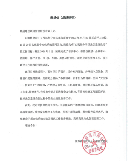 近日,集团收到江苏核电有限公司发来的《表扬信》,对田湾核电站1-6号机组分布式光伏项目部予以表扬。《表扬信》中提到,田湾核电站1-6号机组分布式光伏项目实现首个光伏系统并网发电,提前完成“实现部分子项光伏系统投运”的工作目标,对晨越项目团队不畏困难、实干担当的工作精神提出表扬!