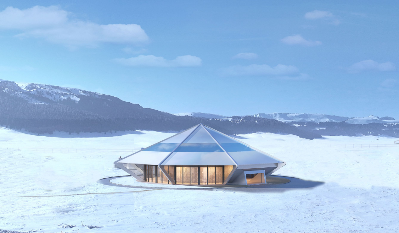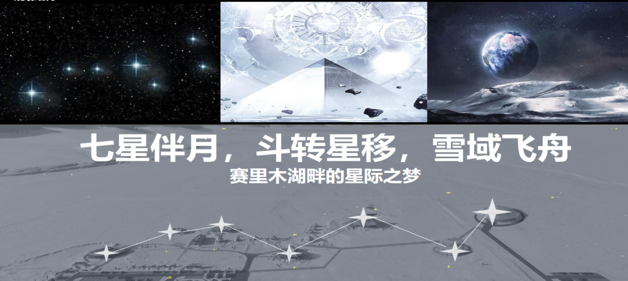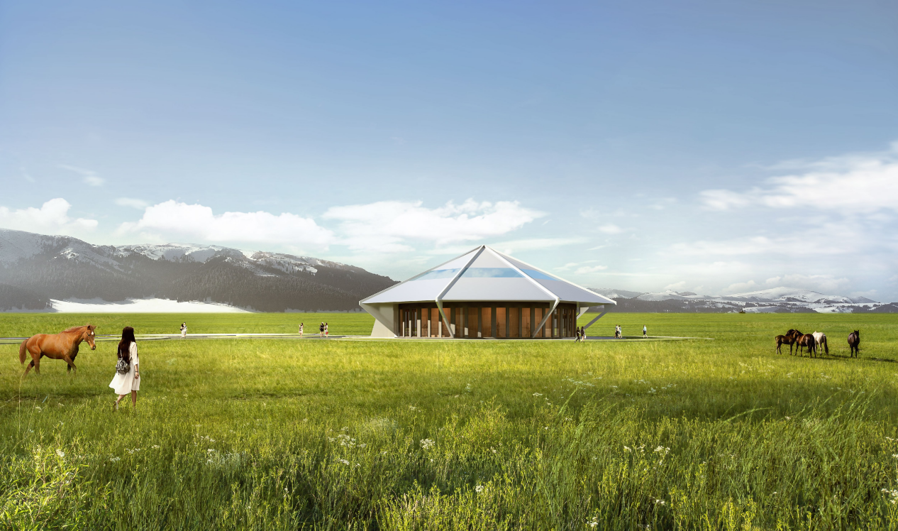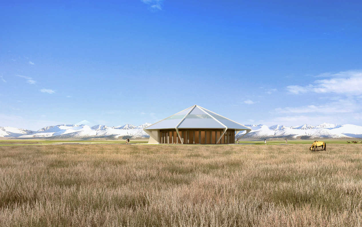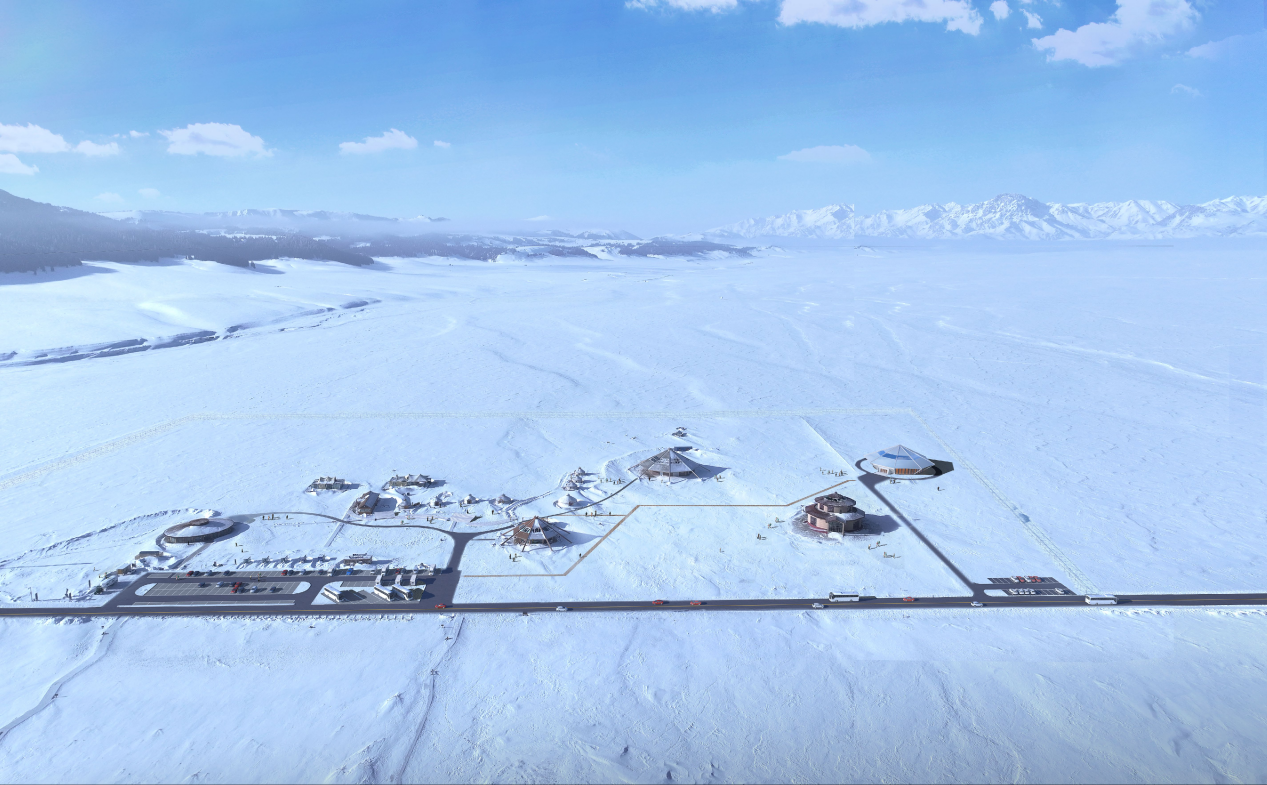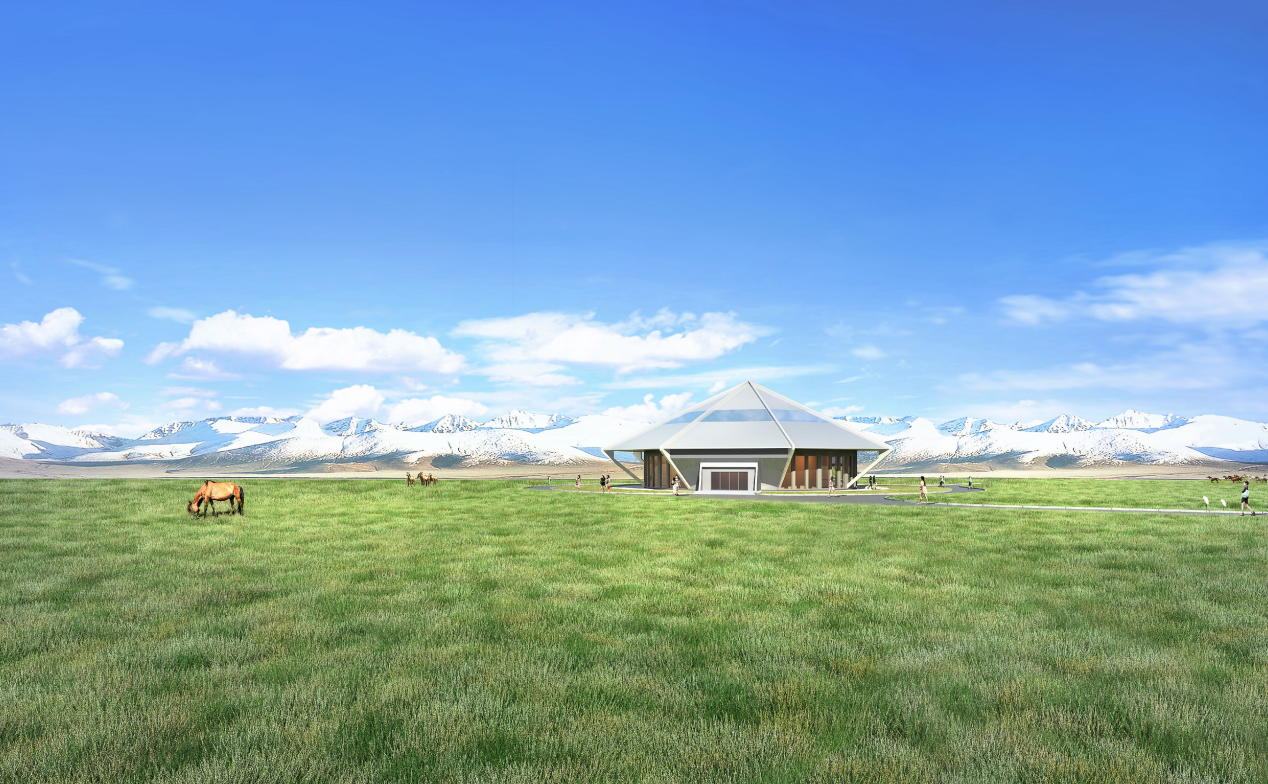 项目总体规划以“斗转星移,雪域飞舟”为理念,将游客服务站等单体建筑构想为一艘艘穿越星河的璀璨飞舟,破开时空壁垒,降落在天山雪岭环绕的赛里木湖畔,与壮丽的自然景观融为一体,将周边建筑通过道路和景观串联起来,犹如七星伴月,构成一幅灵动的画面。设计以传统蒙古包为灵感,融入现代技术元素,打造具有现代感和传统文化特色的建筑以保护自然资源环境为基础,实现生态可持续发展。
