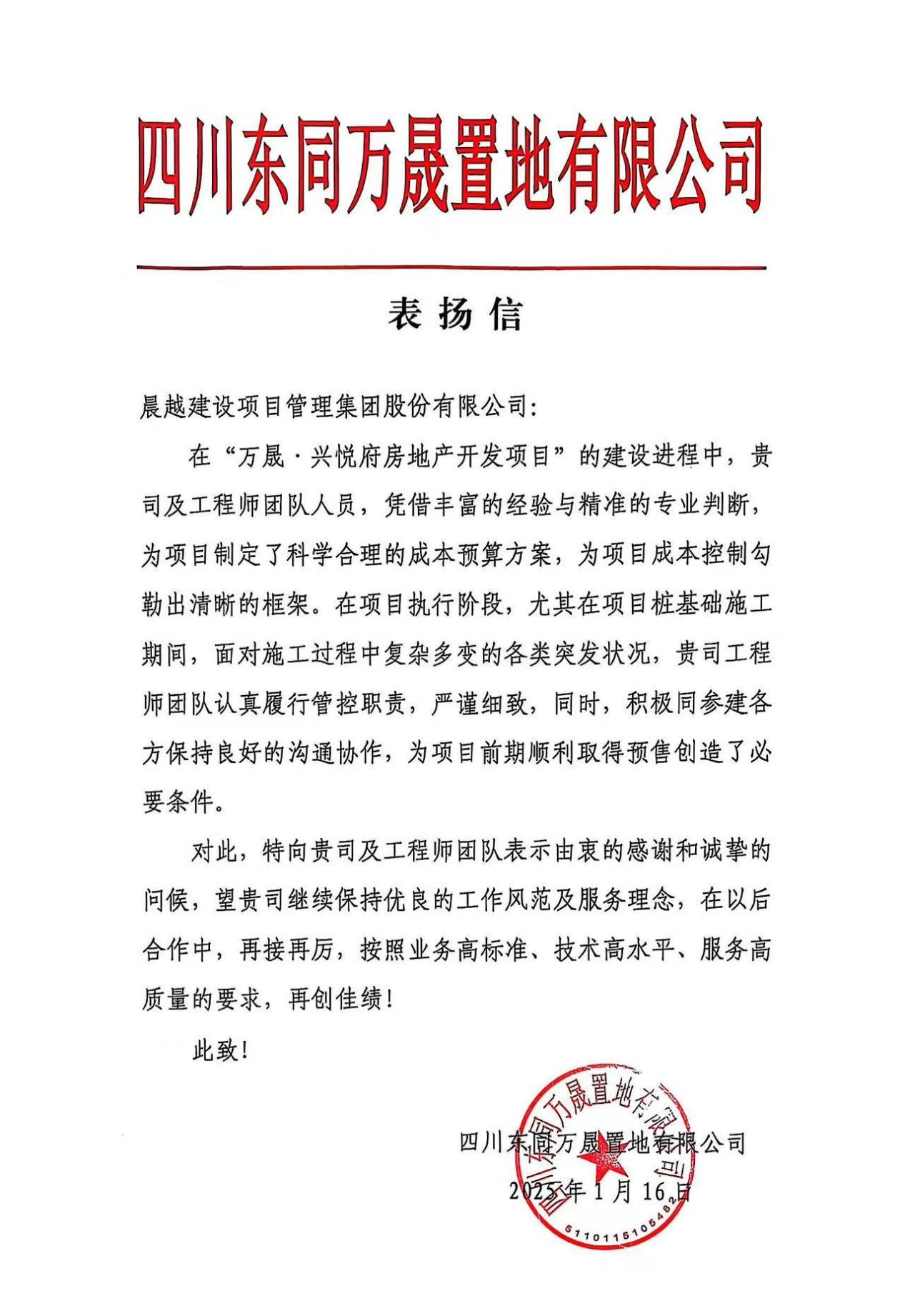 《表扬信》中提到,在“万晟·兴悦府房地产开发项目”的建设进程中,晨越建管集团及工程师团队人员,凭借丰富的经验与精准的专业判断,为项目制定了科学合理的成本预算方案,为项目成本控制勾勒出清晰的框架。在项目执行阶段,尤其在项目桩基础施工期间,面对施工过程中复杂多变的各类突发状况,晨越建管集团工程师团队认真履行管控职责,严谨细致,同时,积极同参建各方保持良好的沟通协作,为项目前期顺利取得预售创造了必要条件。