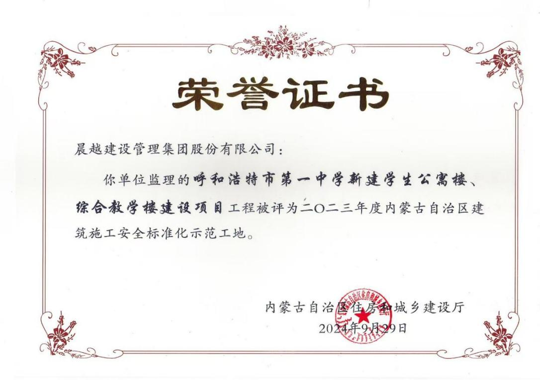 近日,集团收到内蒙古自治区住房和城乡建设厅发来的荣誉证书,集团全过程工程咨询项目——呼和浩特市第一中学新建学生公寓楼、综合教学楼建设项目荣获“2023年度内蒙古自治区建筑施工安全标准化示范工地”,为进一步评定荣誉奖项奠定了基础。