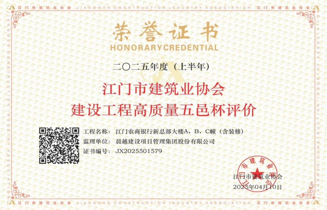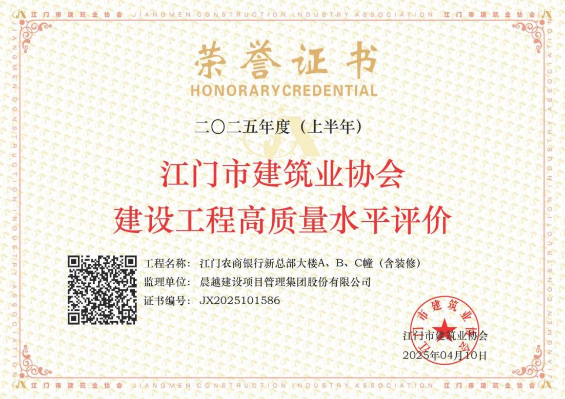- 2025年4月,项目进一步斩获江门市建筑业协会2025年度(上半年)“建设工程高质量水平评价”与“建设工程高质量五邑杯评价”两项荣誉。