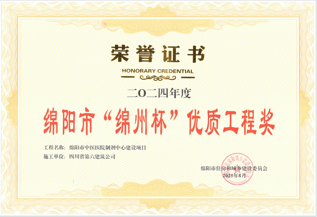 近日,集团绵阳市中医医院制剂中心建设项目荣获2024 年度绵阳市 “绵州杯” 优质工程奖,该奖项是代表绵阳市工程建设质量的最高荣誉之一,是对项目卓越品质与精益管理的标杆评价。