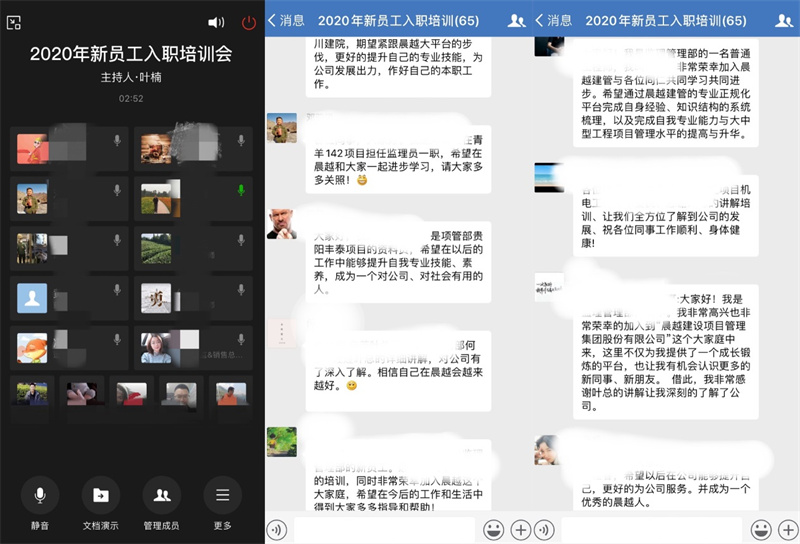 线上新员工入职培训会于5月6日下午15点召开,本次参会新员工涵盖集团总部及遍布全国各地项目部人员。本次培训以集团“务实、进取、价值、共赢、积极、向上”的企业文化展开,带领64位新员工们了解晨越“大数据、大平台、大服务”的经营理念。本次培训以集团党委书记、董事长王宏毅寄语新员工拉开序幕,并对新员工的加入表示祝贺并做了企业文化精神分享。