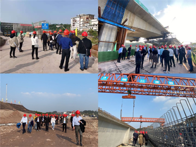 讲解点2:高铁连接线西二段由标段负责人杨刚带病坚持进行讲解,标段总投资额4.2亿元,线路总长1.53km,已完成总投资进度77.1%。采用“桥梁+地坪式道路”的建设形式,主线建设标准为城市快速路,标准段横断面宽度80m,双向八车道。标段建设重点为:釜溪河二号桥、釜溪河三号桥。均为主桥大跨径变截面连续箱梁一跨跨越釜溪河,采用悬臂现浇法施工。引桥为等截面预应力现浇箱梁,采用盘扣支架施工。