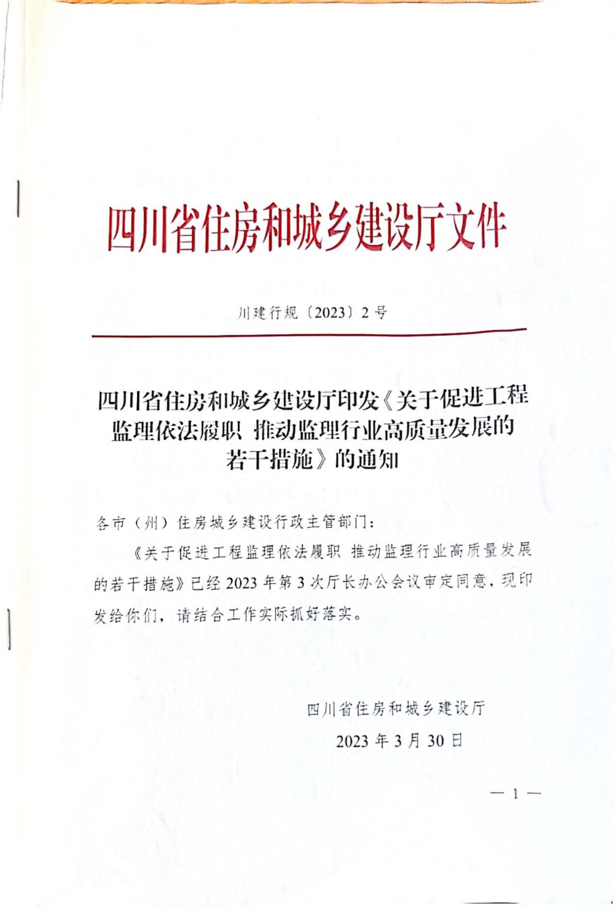 为深入贯彻落实党中央、国务院和省委、省政府关于工程监理行业改革工作决策部署,促进工程监理依法履职,充分发挥工程监理在质量和安全生产中的管控作用,推动监理行业高质量发展,四川省住房和城乡建设厅在深入调研、充分沟通、认真总结的基础上,制定《关于促进工程监理依法履职 推动监理行业高质量发展的若干措施》,将于2023年5月1日正式实施。